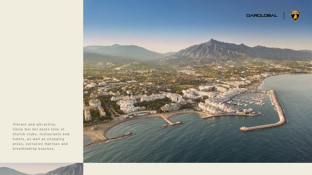 ultra-luxury development by DarGlobal in Benahavis, Spain. It comes in collaboration with the iconic Automobili Lamborghini brand and is the first branded project in Spain. There is a collection of just 53 exquisite 4–6 bedroom villas available for purchase in the gated community. The initial cost for a property is EUR 4M (AED 16M or USD 4.3M).